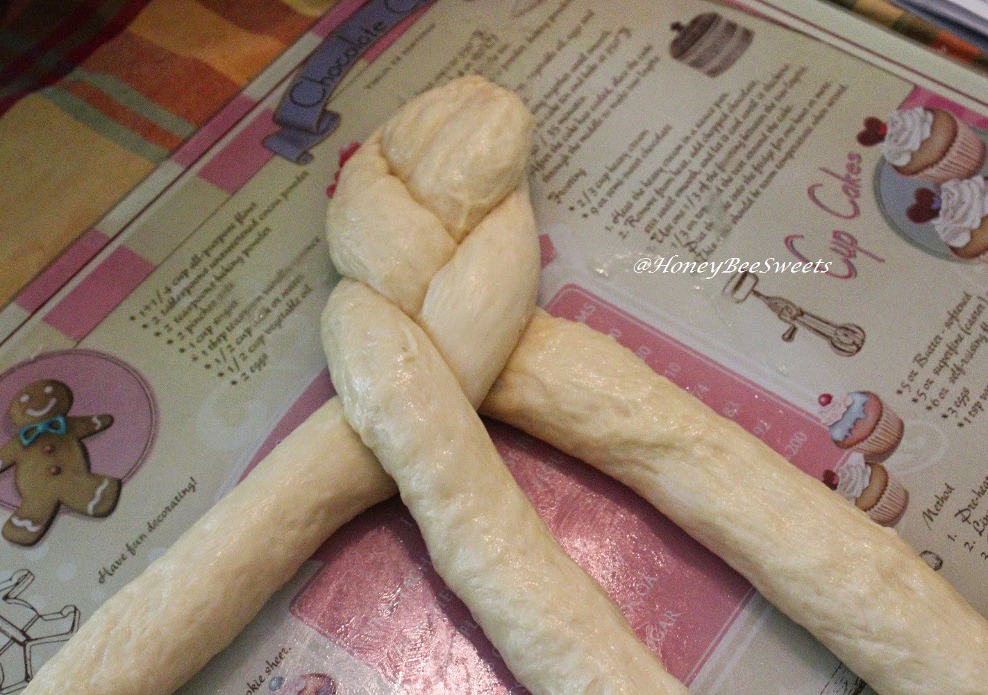 - Repeat for the rest of the dough portions. You will then have 3 poles like dough, about a feet long. Then pinch the tip of each portion together, then start braiding it, like how you would tie your daughter's hair, haha.